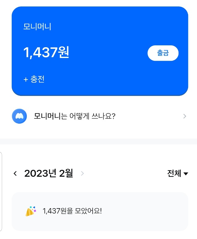 단, 모니머니를 내 계좌로 출금하기 위해선 나의 대표 통장을 등록해야 해요. 네 데이터 연결을 진행해야하니 미리 진행해 주세요. 아래는 더보기 -> 상단의 모니머니 파란색 화면 클릭 했을 때의 다음 화면입니다. 여기서 출금을 누르면 연결된 통장으로 입금됩니다.